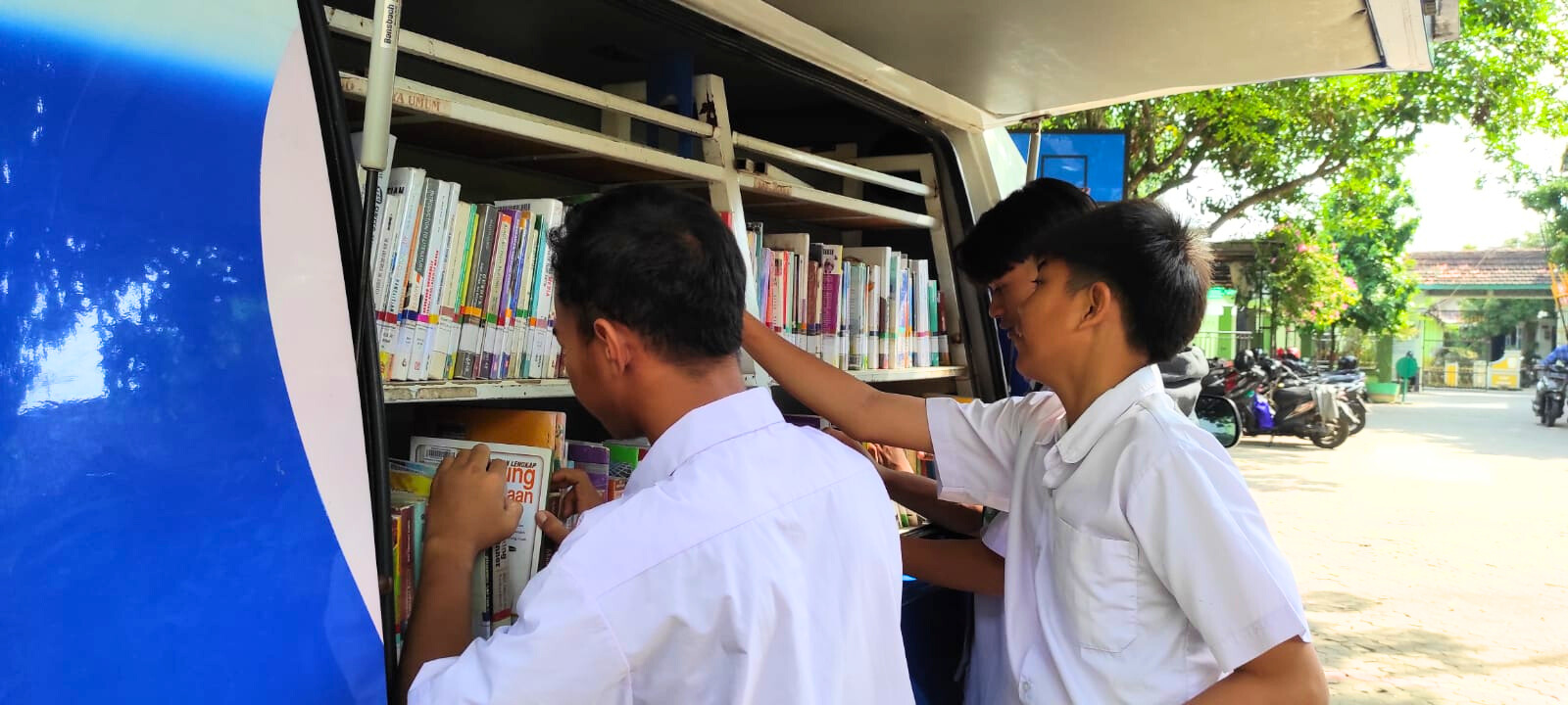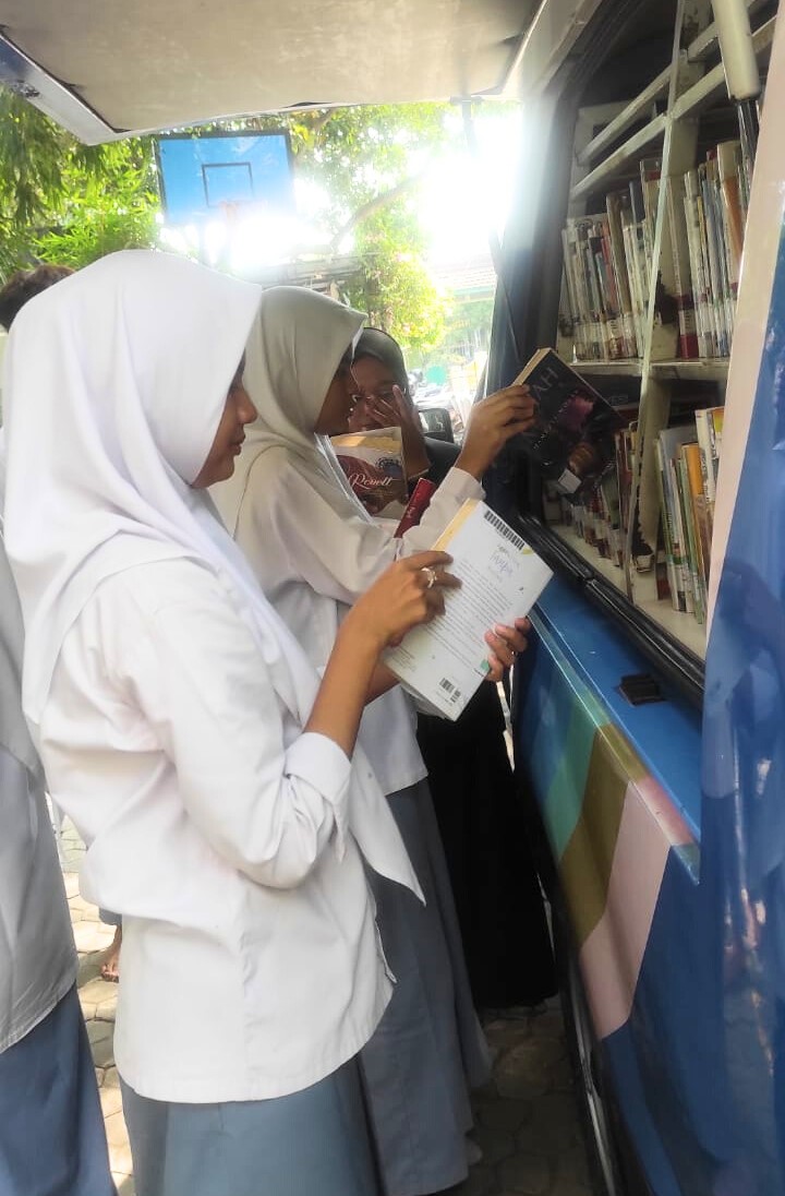 Mobil perpustakaan keliling yang penuh warna dan menarik perhatian terparkir di halaman Madrasah Al Hikam. Rak-rak buku yang tertata rapi di dalamnya memuat berbagai koleksi buku, mulai dari buku pelajaran, sains, fiksi, hingga non-fiksi. Petugas perpustakaan dengan ramah melayani para siswa yang ingin meminjam atau membaca buku di tempat.