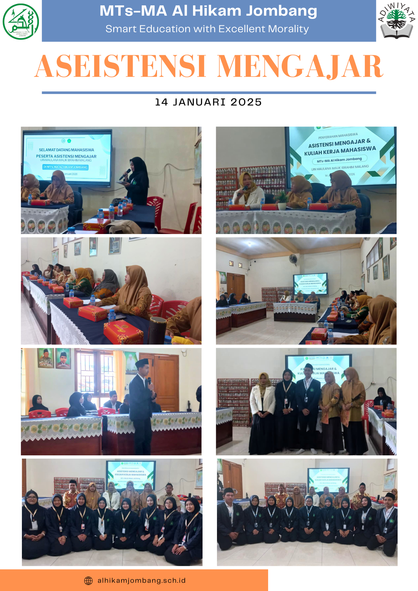 Jombang, 14 Januari 2026 – Civitas akademika MTS-MA Al Hikam Jombang menyambut kedatangan rombongan mahasiswa program Asistensi Mengajar (AM) dari Universitas Islam Negeri (UIN) Maulana Malik Ibrahim Malang pada Rabu (14/01/2026). Prosesi penerimaan yang berlangsung khidmat ini digelar di Ruang Adiwiyata mulai pukul 09.00 WIB.